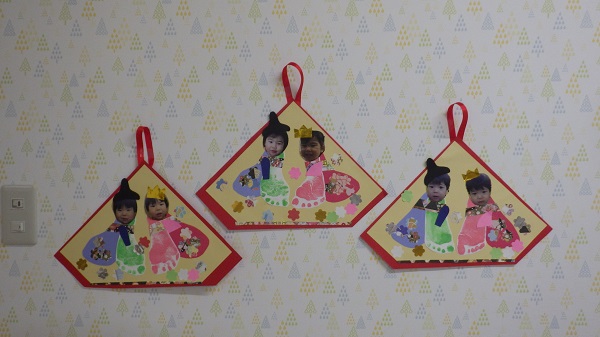 いちご組さんのひな人形は、お内裏様、お雛様の身体を足型スタンプで取ってみました。 烏帽子、尺、冠、扇、お花をシールにして貼りました。「ペタペタ」と楽しんで貼っていた子どもたちです。かわいいひな人形が完成すると、「かわいいね」と教えてくれまし… -