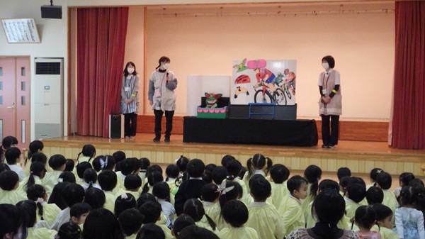 今日は全園児で交通安全教室がありました。かわいいクルックと一緒にクイズに答えたり、横断歩道の渡り方を教えてもらったり、楽しく交通安全について学ぶことができました。年長組さんは園庭で実際に4人ずつ左右を確認しながら、横断歩道を渡る体験をしま… -