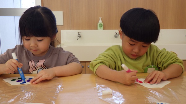 めろん組では、ひな祭りに向けて製作を行いました。製作の前には、実際にひな人形を見てから、ひな祭りについてのお話をしました。はじめに、コーヒーフィルターに水性ペンで模様を描き、水を含ませた綿でポンポンとすると、模様がにじみ、「花火みたい!… -