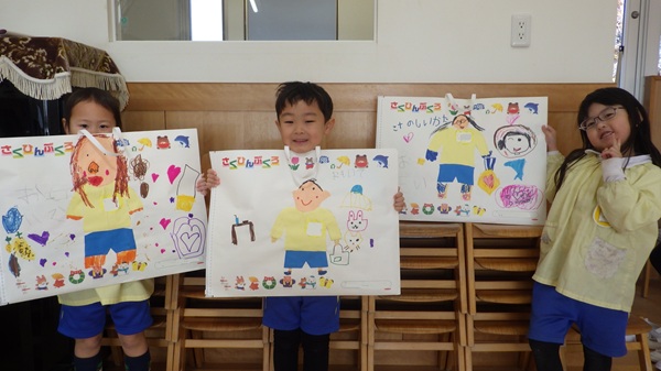 年中組では、みんなの宝物を入れる「宝物バッグ」を作りました♪バッグには、顔やスモックを自分で切り、顔を描いて自分の姿を表現しました。また、「おもいで」と鉛筆で書き、「こんな思い出があったね」と振り返りながら、周りに思い出の絵を描きました。… -