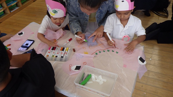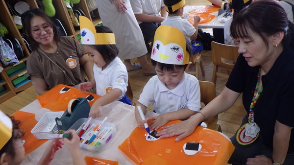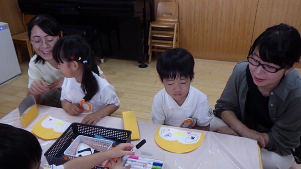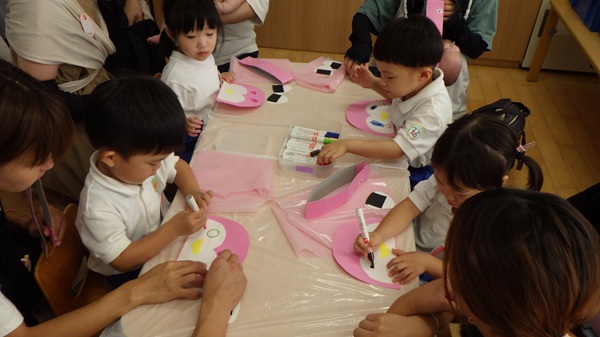 運動会に向けた衣装作りでは、「おめめは○色にするー!」「ハートもいっぱいかきたい!」と子どもたちのアイデアがたくさんあふれ、お母さん・お父さんと一緒に楽しく作ることができました♪
