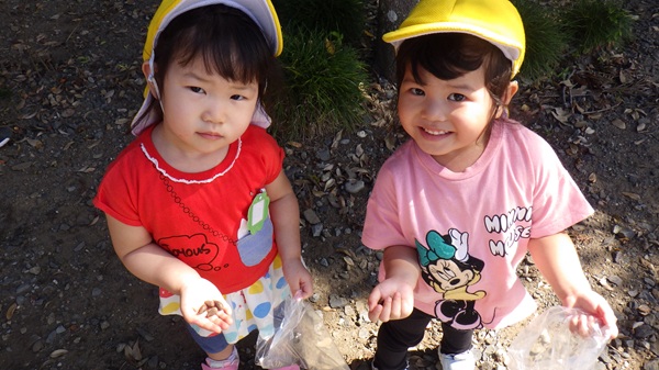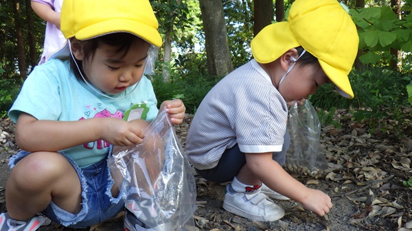 「ここにもあったよ!」と教え合ったり、拾ったどんぐりをお友だちにプレゼントしたりと、子どもたち同士のやりとりもとても微笑ましかったです。