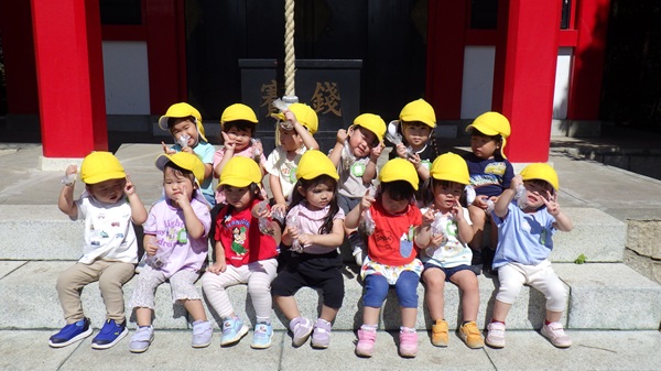 お部屋で「どんぐりころころ」を歌うのが大好きなめろん組さん♡神社に着くと、どんぐりや葉っぱ、木の枝を見つけて大喜び!