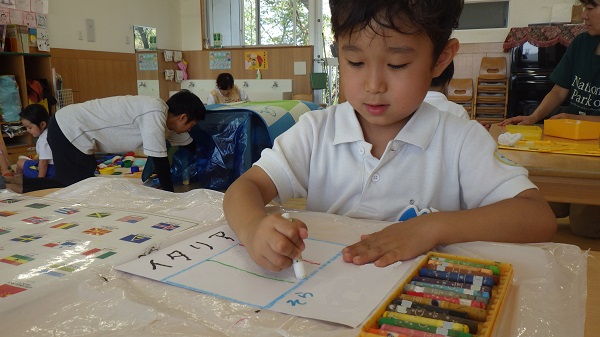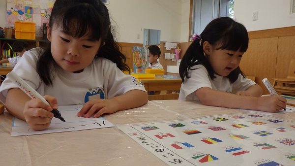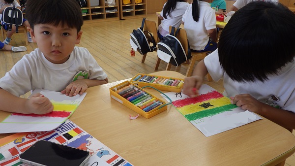 世界中の国旗の中から子どもたちがお気に入りを選び、ヨーロッパやアジア、アメリカ大陸の国などの様々な旗を丁寧に作りました。旗を作りながら「ベルギーはねチョコレートがすごいんだよ!」「ドイツの黒いところが好き」など、その国のことを教えてくれたり、どこがお気に入りなのかを説明してくれたり、とても楽しみながら国旗作りをしていました!