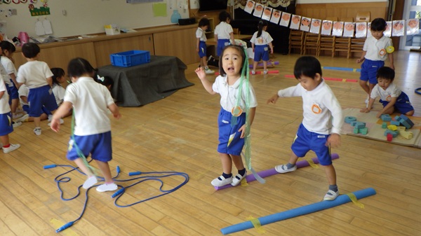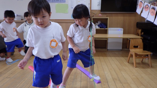 縄跳びを蛇に見立てて「触らないように…」と慎重に進んだり、「けんけんぱ!」で元気にジャンプしたりしながら、いろいろな動きを自分なりに楽しむ姿が見られました。