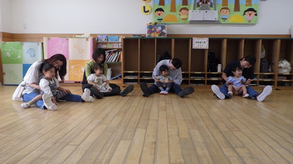 まずはどんぐりころころの曲に合わせて親子で触れ合い遊び♪少しずつ笑顔が増えてきたところでリトミックのスタートです。