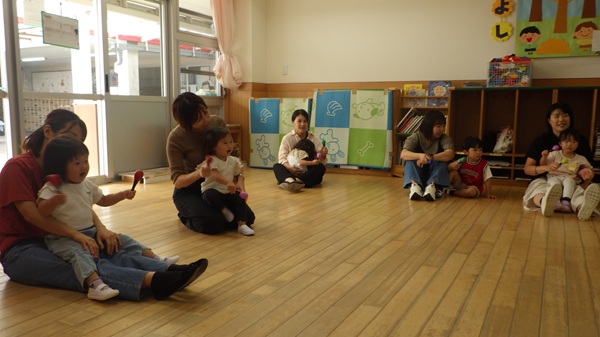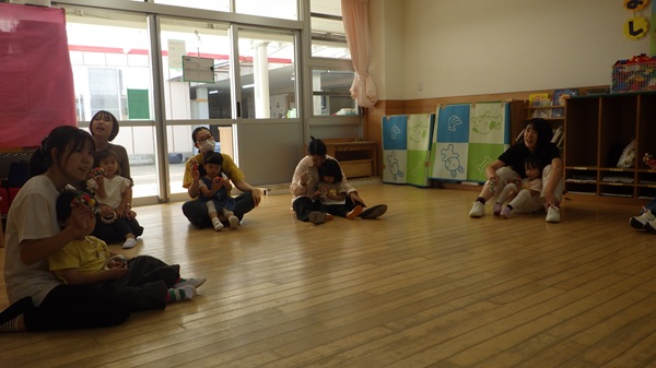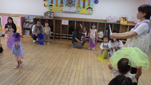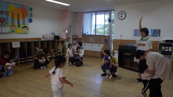 タンバリンで車に変身したり、りんご狩りをしたり、色々な動物や虫に変身したりしました。途中、マラカスで『アイアイ』を歌ったり、スカーフで鳥やトンボに変身したり、鈴で虫の声を歌ったりして音を楽しみました。