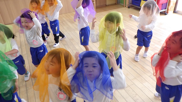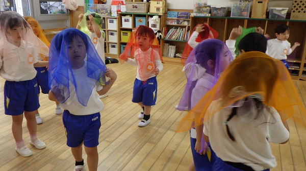スカーフを使って、お化けに大変身!先生やお友だちと一緒に歓声を上げながら、素敵なハロウィンパーティーを過ごすことができました♡