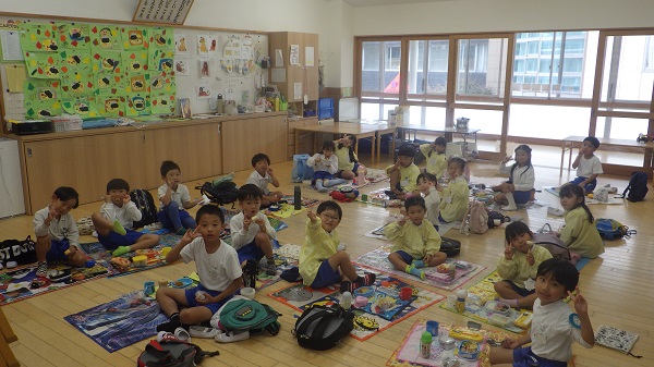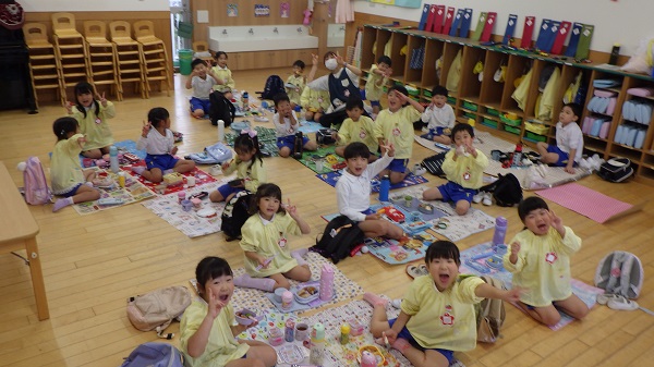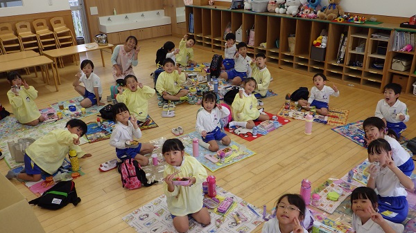遠足ごっこ(年長組) 2025 10/16 こども園の様子 2025年10月16日2025年10月17日 今日は年長組さんがお部屋で、遠足ごっこをしました♪お部屋でレジャーシートを敷き、お弁当とおやつを食べました。「明日の遠足楽しみだね!」と期待が高まっている様子でした。明日は晴れますように♡ こども園の様子 リトミック(ひよこ・めろん) 学年集会(年少組)