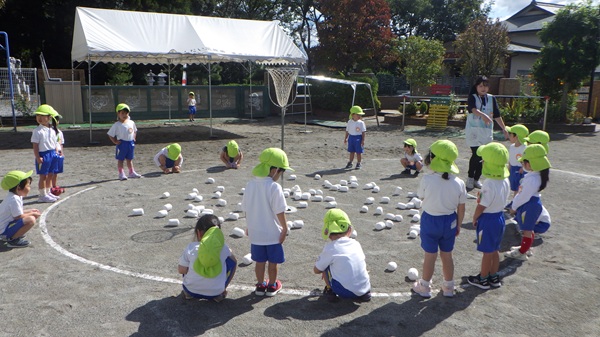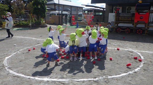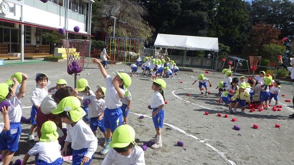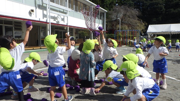 年長さんが玉入れをする様子を応援していた年少組さんは、円の周りに座ったり、カゴをめがけて玉を投げたりと、ルールはバッチリでした♡
