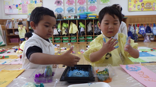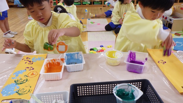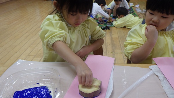 2日目には、年長組さんが掘ってきてくれたさつまいもを使って、いも版で「七五三」の文字を押しました。