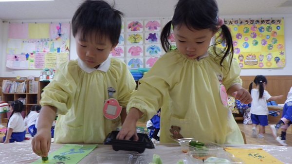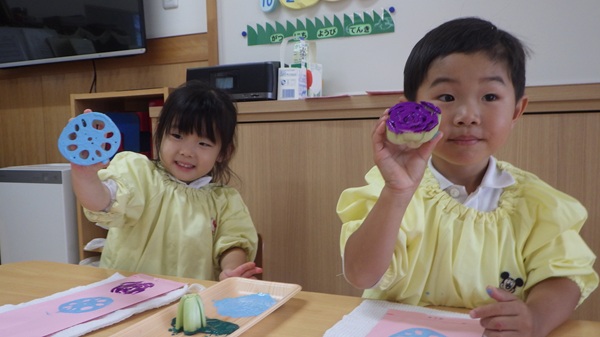 今回はお野菜のスタンプに挑戦し、オクラやピーマン、チンゲンサイなどの断面を見て「お花みたい!」「星のかたちだね!」と楽しそうに話していました♡