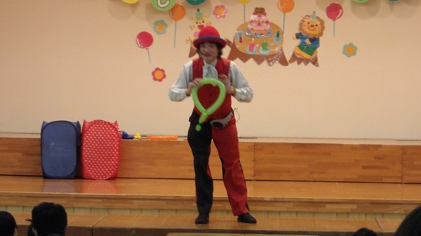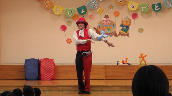 お誕生会の最後には、「ごっちくん」によるバルーンショーがありました。細長いバルーンが様々なものに変身する様子に子どもたちは釘付けとなり、楽しい時間を過ごすことができました♪