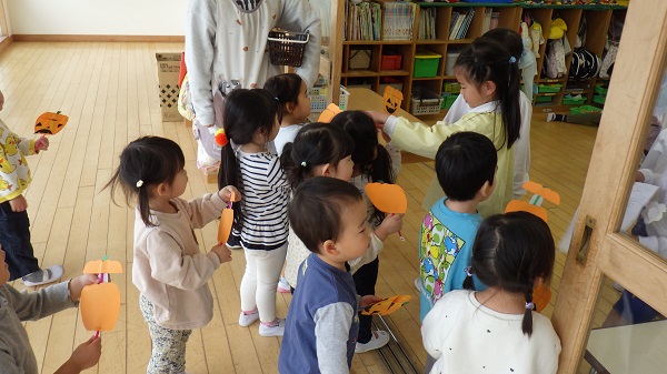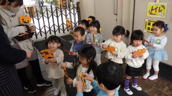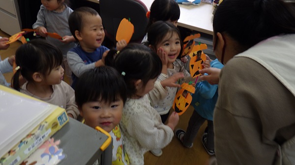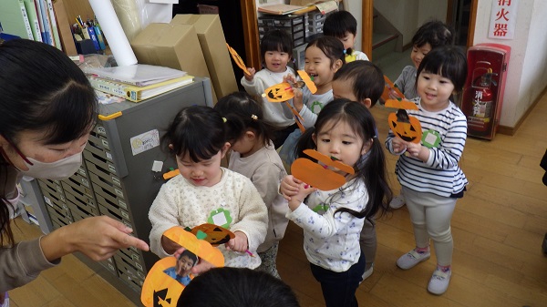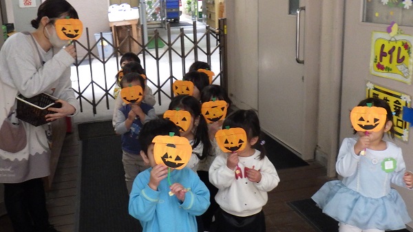 先日作った、ジャック・オ・ランタンを手に持ち「カボチャに変身!」「ハッピーハロウィン♪」と言いながらお散歩に行きました。ジャック・オ・ランタンの顔からは、おばけに扮した子どもたちが飛び出してくる仕掛けが!