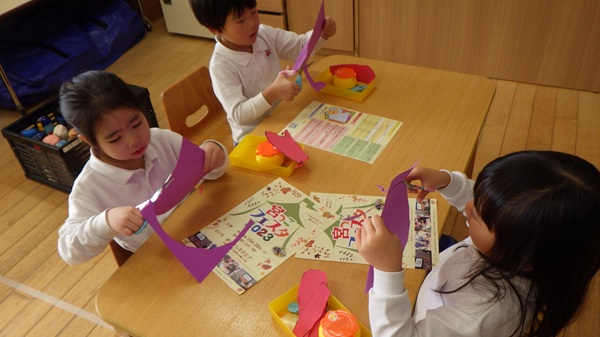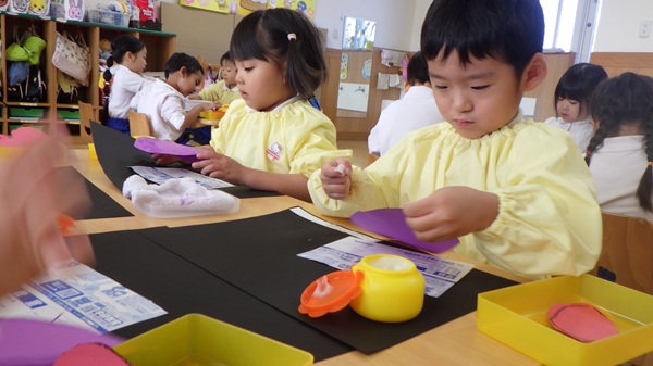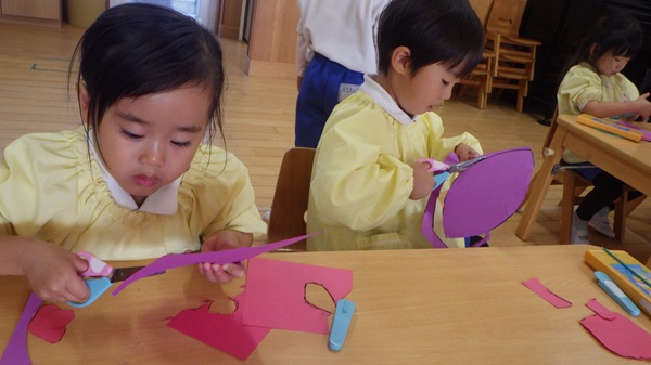 1日目は、さつまいもの形が描かれた紫色の画用紙をはさみで切りました。もう一枚の画用紙には、クレヨンで自分なりのさつまいもの形を描き、それを切ることにも挑戦しました。「細長いおいもにする!」「赤ちゃんいもにしようかな?」と楽しそうに話しながら、思い思いの形に切り取ることができました。その後、のりで台紙に貼り付けました。