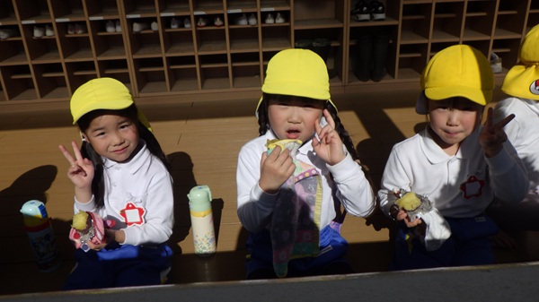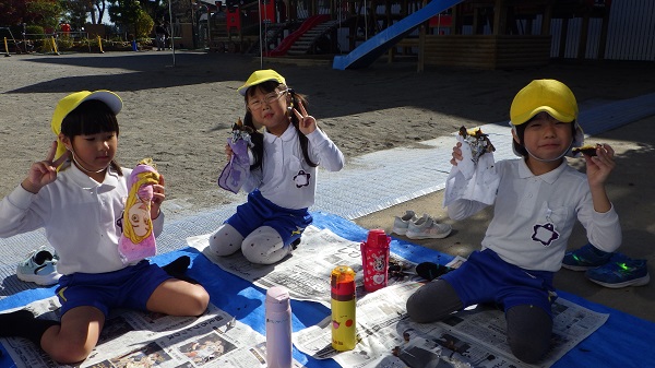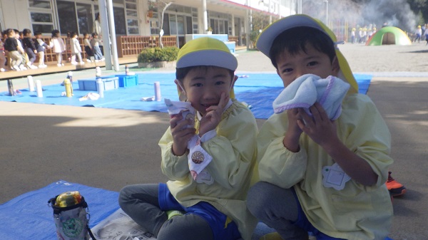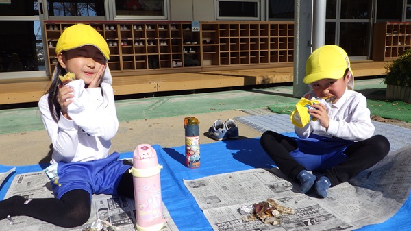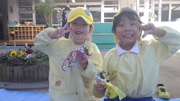 焼きいもができあがると、お手伝いにきてくださったスマイル隊さんに「ありがとうございました!」のお礼を言ってから、いよいよ「いただきまーす!!」♪焼きたてほくほくの焼きいもに「おいしい!」「おかわり!!」の声が園庭に響いていました。