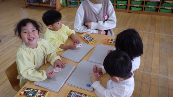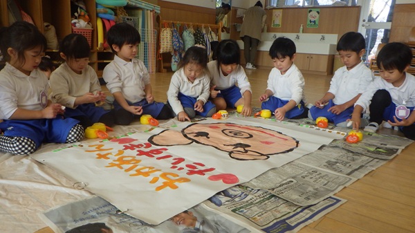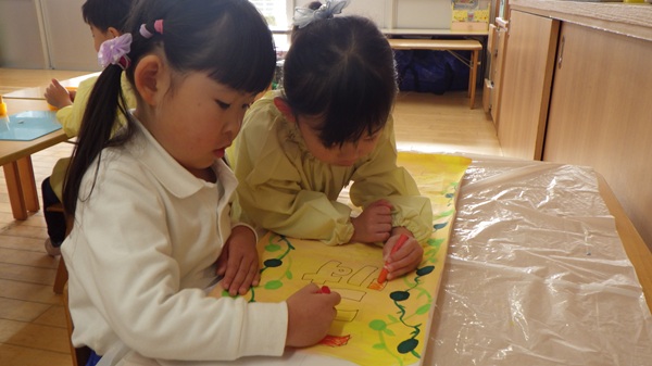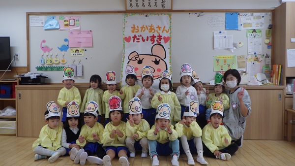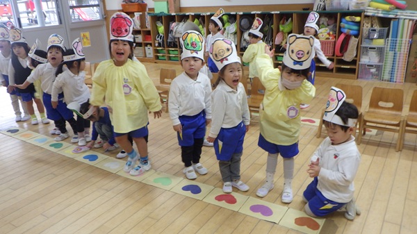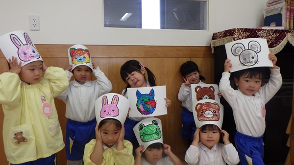 自分で作ったお面をかぶることを楽しみにしていた子どもたちは、同じ役の友だち同士で仲を深めながら取り組んでいます。