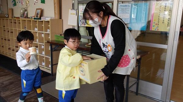 登園後、子どもたちが担任の先生と一緒に募金箱に募金させていただきます。