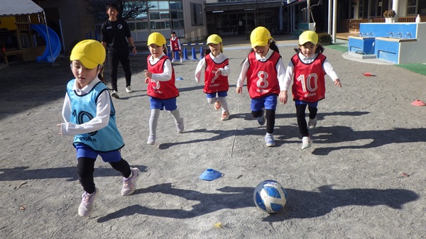 また、大好きなサッカーの試合も、いつもより長い時間行うことができ、思い切り体を動かしながら、年長組最後の運動指導を楽しみました。