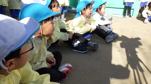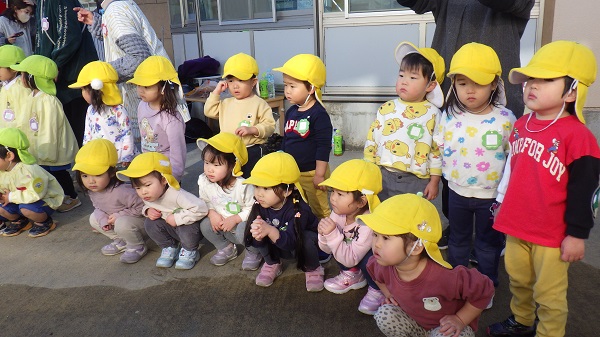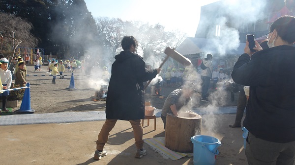 年長組のお兄さん・お姉さんが頑張ってもちつきする姿みんなで、「よいしょ~!」と、大きな声で応援することができました。