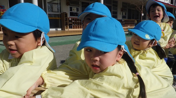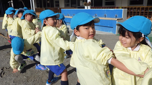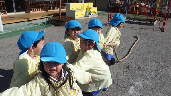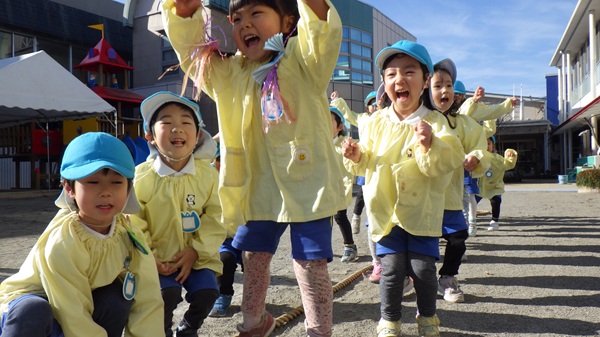 綱引きではクラス対抗で行い、どのクラスも力を合わせて綱を引きながら、楽しそうに参加していました。見学しているクラスからは、「どっちもがんばれー!」と応援の声が聞こえてきました。