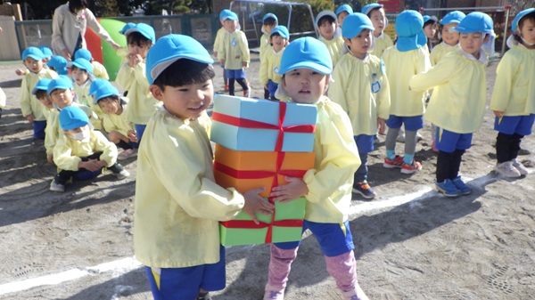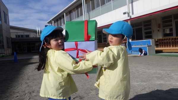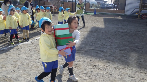 プレゼントリレーでは、プレゼントの箱のバランスを保ちながら運ぶという少し難しいルールでしたが、箱が崩れないように二人で協力して走る姿や、ゆっくり慎重に運ぶ姿が見られました♪
