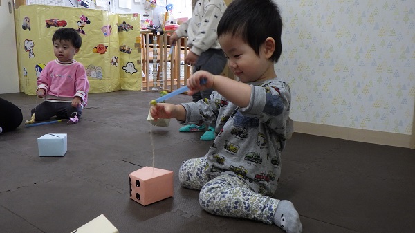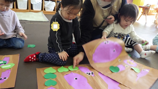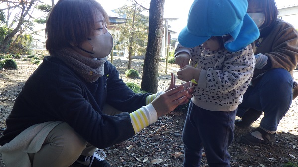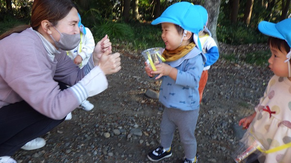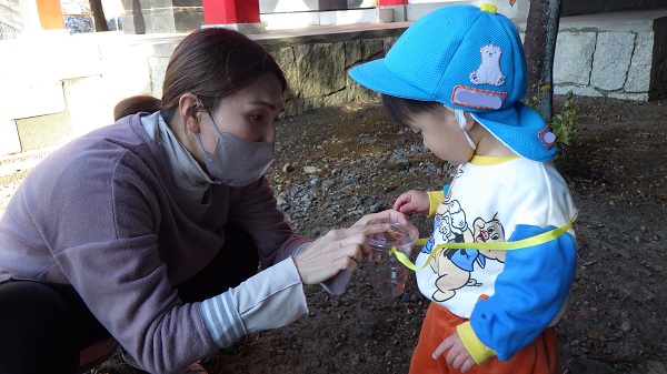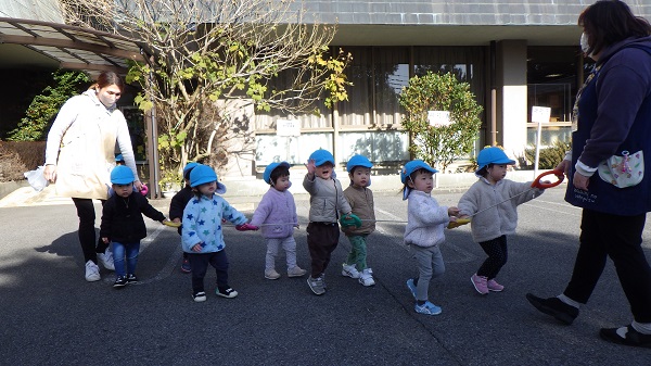 お天気の良い日には、大好きなお散歩へ行きます。「ねこちゃんいるかな?」「わんちゃんいるかな?」と会話を楽しみながら歩いています。誘導ロープで歩くのも上手になり成長を感じることができます。