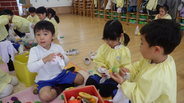 大掃除(年中組) 2025 12/27 こども園の様子 2025年12月27日 年末に向けて、毎日使っている保育室の大掃除を行いました!「おもちゃ拭いたらキレイにしまおう!」「雑巾が真っ黒になったよ!」と最後まで丁寧にお掃除をしてくれました♡良い年が迎えられそうです! こども園の様子 折り紙製作「みのむし」(年中組) 令和7年度 親子らんど第3弾の追加募集について