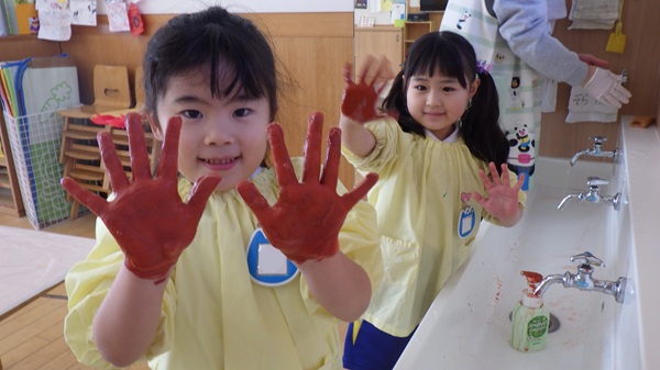 手形を馬の体に見立て押し、たてがみやしっぽをちぎり貼りしました。