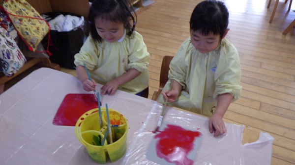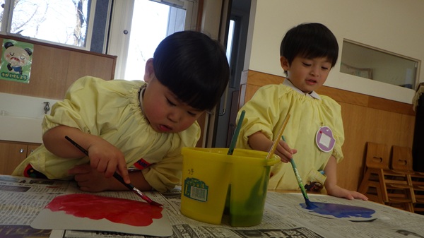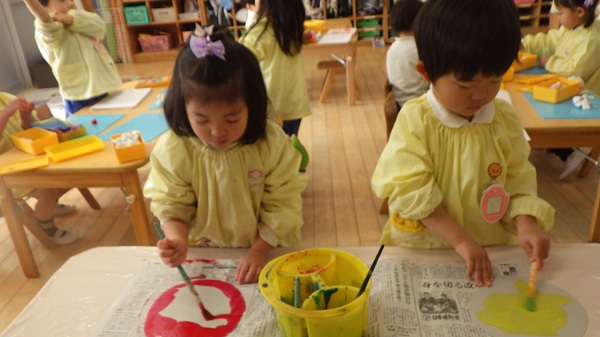 1日目は、好きな色の絵の具を選び、筆を使って塗りました。花紙も一人6~10枚選び、両手で丸めて鬼の髪の毛を作りました。同系色にしたり、一色ずつ選んでカラフルにしたりと、楽しみながら取り組みました。