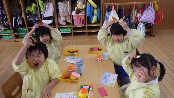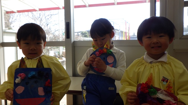 のりで顔のパーツや花紙の髪の毛をペタペタと貼り、最終日には、鬼の顔をクレヨンで描きました。