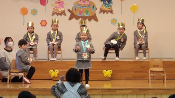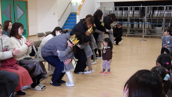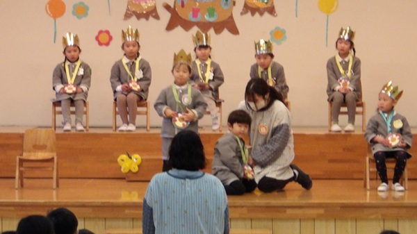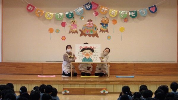 お誕生会の最後には、年中組の先生による節分に関する紙芝居やクイズの出し物がありました。お話に登場する子の心の中の鬼をやっつける場面では、みんなで「鬼は外!福は内!」と元気に声を揃え、クイズも大いに盛り上がり、素敵な時間を過ごしました。