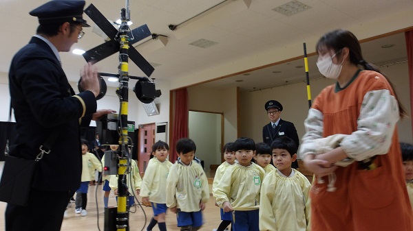 ぷれいほーるに入ってくると、本物そっくりの踏切を見て「すごい!」「かっこいい!」と、目を輝かせていました。最後には、みんな踏切を実際に渡り、年中さん年長さんは非常ボタンも押させていただきました。