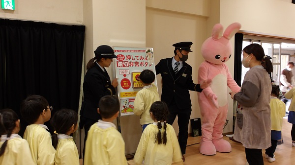 今日は、JR東日本宇都宮統括センターの皆さんが、ふみきりの渡り方や非常ボタンの使い方についてのお話を、わかりやすくしてくださいました。