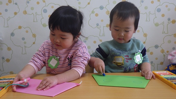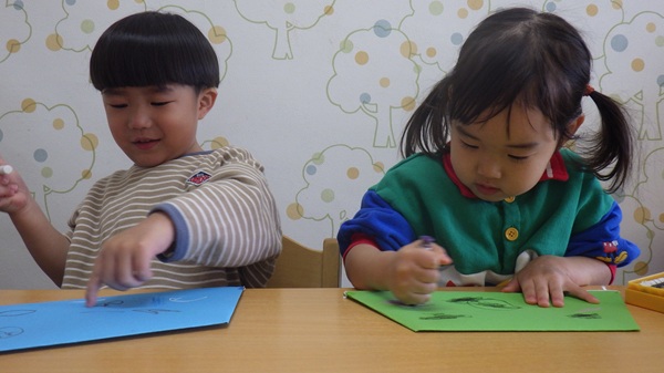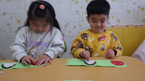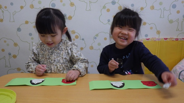 「かわいい鬼にしよう!」「怖い鬼になったよ!」と友達同士で楽しく会話をしながら個性豊かなお面が完成しました。
