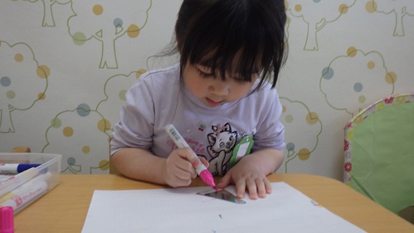 4色あるお面の中から好きな色を選び、鬼の顔を描きました。角は1本か2本を選んだあと油性ペンで模様を描くことに挑戦しました。