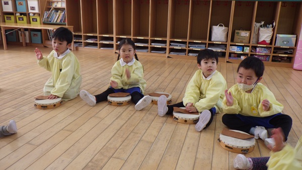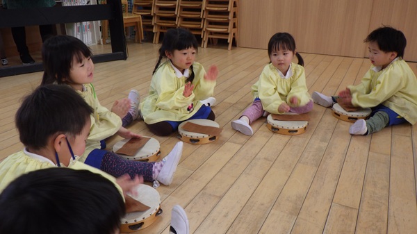 タンバリンをハンドルに見立てて、ピアノの音に合わせて歩いたり止まったり、クラクションを鳴らすように叩いたりしました。