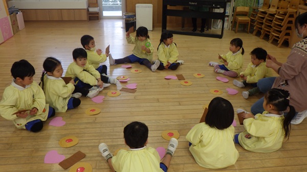 また、タンバリンをまな板に見立てて、リズムに合わせてチョコレートを切ったり、鍋に見立てて揺らしたりと、様々な音を鳴らして楽しむ子どもたち!