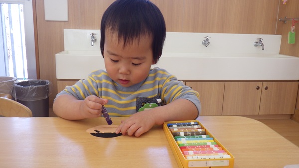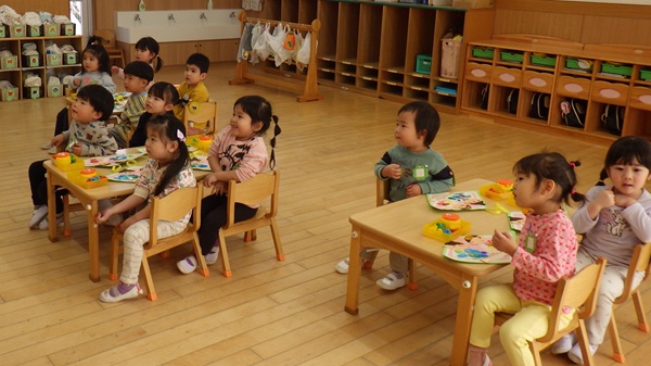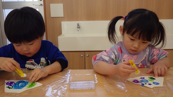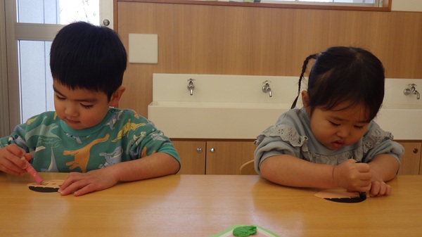 また、全員で花紙を丸め、のりを付けて貼ることにも挑戦!先生の話をしっかり聞きながら、とても上手に貼ることができました。