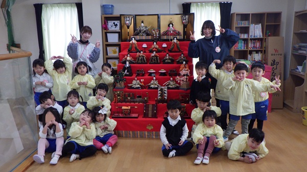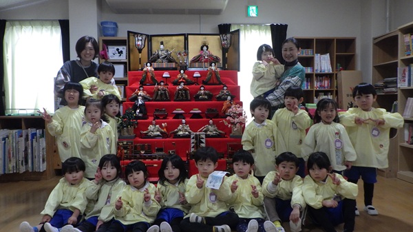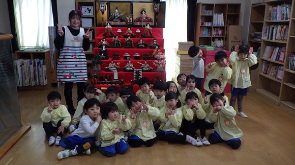 作る前に本物のおひなさまを見に行くと、「かわいい~」「たいこ持ってるよ!」と、じっくり観察する子どもたちの姿が見られました。