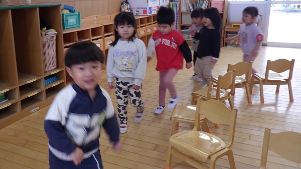 今日はルールのある遊びとして、お部屋でイス取りゲームをしました。