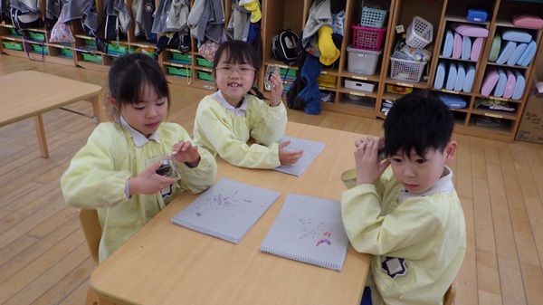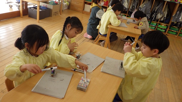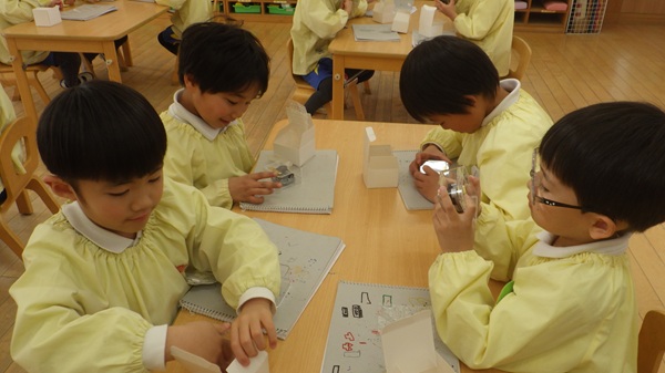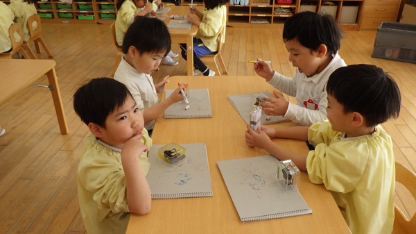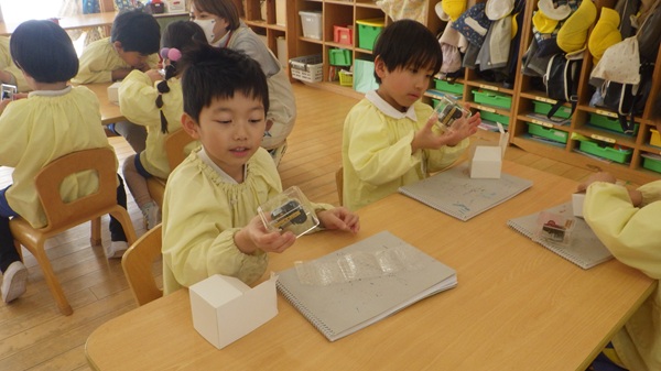 ネジを回すと園歌が流れ、「すごい!園歌だ!」と子どもたちは驚いた様子でした。
