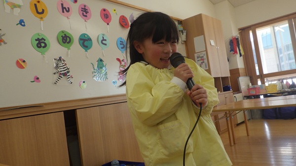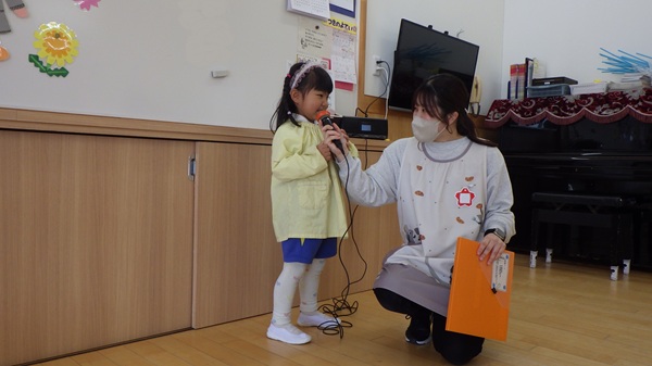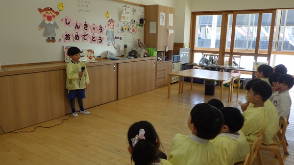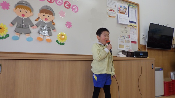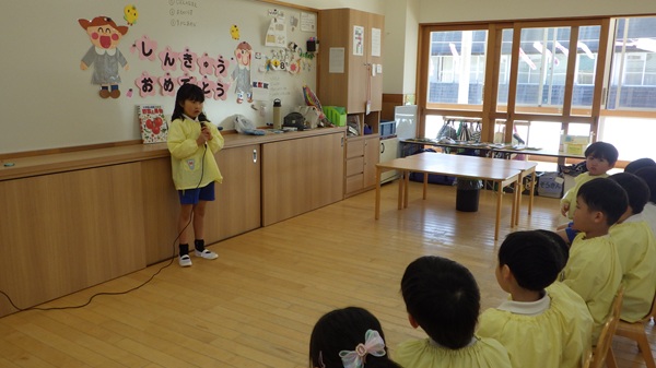 名前・前のクラス・好きな遊びの3つの質問に、少し緊張した表情をしながらも、マイクを使って一人ひとりしっかりとお話ししました。