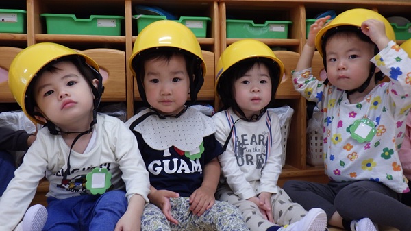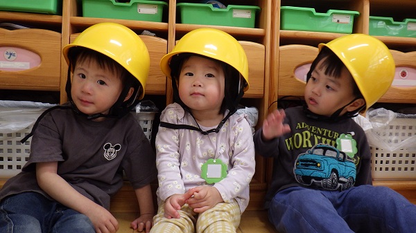 みんなの大切な頭を守るために、ヘルメットを被ろう!と見せると、「お兄さんと一緒だ!」と嬉しそうに自分でヘルメットを被ることができました。