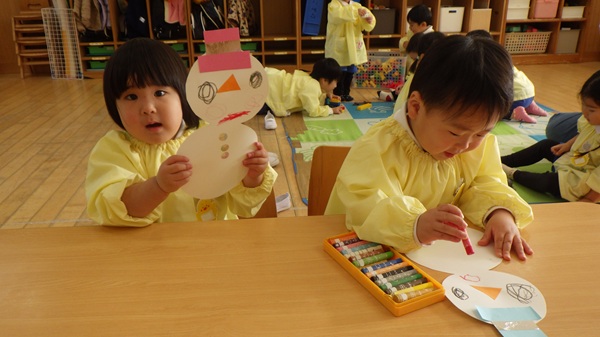 ひよこ組では今週、雪だるま製作を行いました。雪だるまの手の部分は絵の具で手形を押し、「つめた~い!」と絵の具の感触を味わいました。雪だるまの鼻はのりで貼ることに挑戦! 可愛い帽子も好きな色を選んで貼りました。顔はクレヨンで「目は黒!口は赤... -