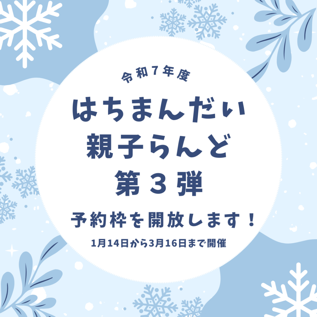 1月5日 開催前に定員が埋まったため、1~3グループすべての募集を3枠開放しました!たくさんのお申込みありがとうございました参加をご検討されていた方はこの機会にぜひお申込みください!.はちまんだいでは、2026年1月~3月の間、未就園児の方(1〜3歳)... -